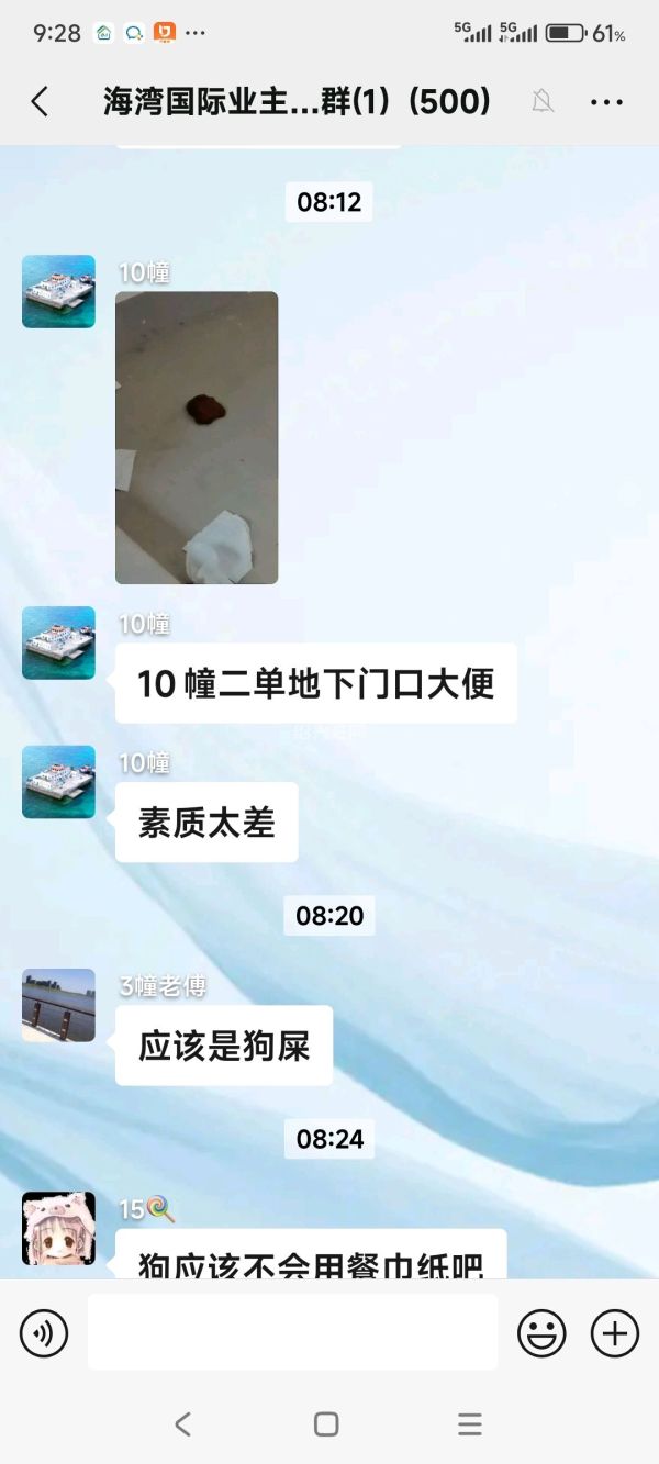 一早老俵跟我来吐,真想吐!伊住的海湾国际地下室门口边,一堆大便便,据目测是狗便,下楼来便,勿找地方,就地随便,还便了不处理!真是没德!