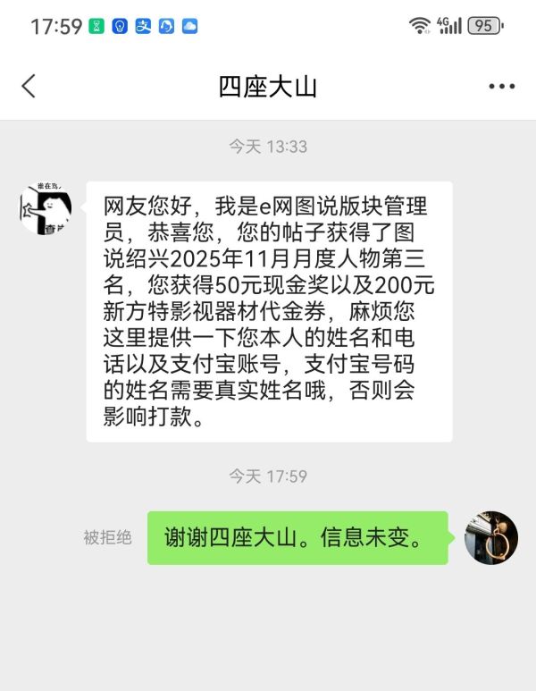 注:获奖的网友们尽快联系四座大山,提供自己的真实姓名+电话号码+支付宝账户