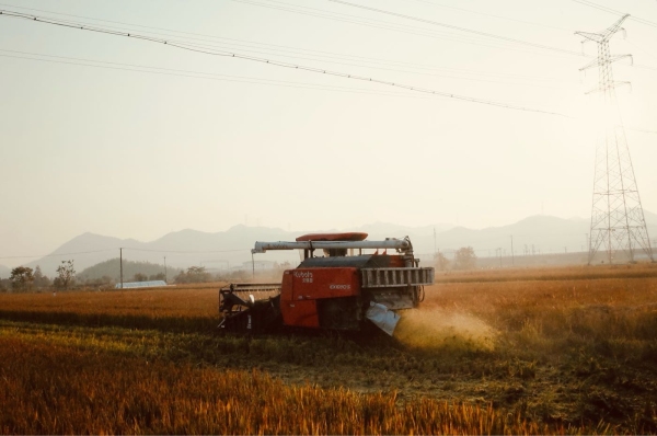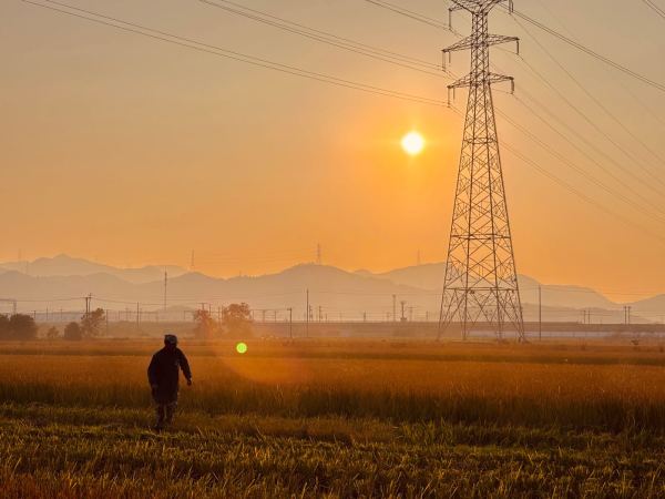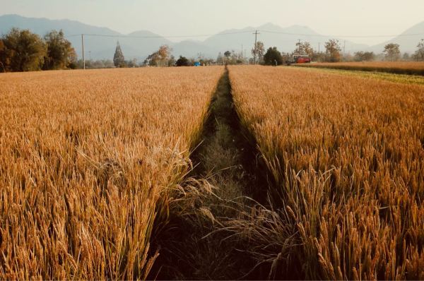 小雪那天,我们从梅坞古道徒步结束已是下午落日时分,我驱车回家路过上虞外湾村时,看到大片金色的稻田,一台联合收割机在金浪里轰鸣,谷粒在暖阳下飞扬。