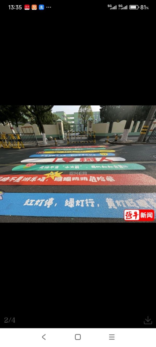 树人小学门口的斑马线色彩更丰富,有白、蓝、红、绿四色,线上印着“马路不是游乐场,蹦蹦跳跳危险藏””校门口,不乱窜,有序进出才最棒“等校园相关标语,既醒目又充满教育意义。