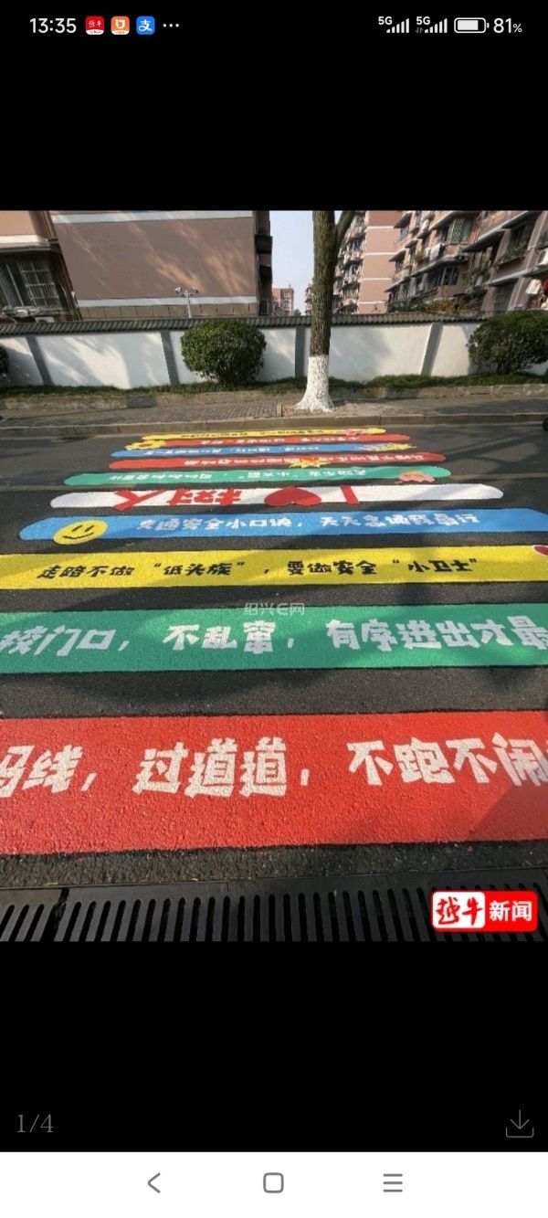 近日,有绍兴市民向越牛新闻报料称,绍兴越城区城南街道朝阳路上的斑马线被刷成五颜六色,还写上了文明标语,看起来很亮眼,也很温馨。