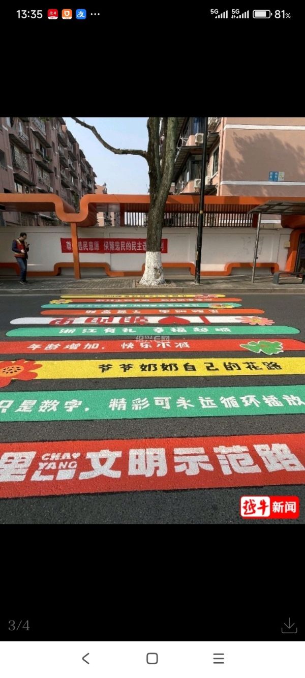 翠苑新村门口的斑马线则融入社区元素,搭配“爷爷奶奶有自己的花路”“年龄增加,快乐不减“等温馨标语,色彩搭配活泼却不杂乱。