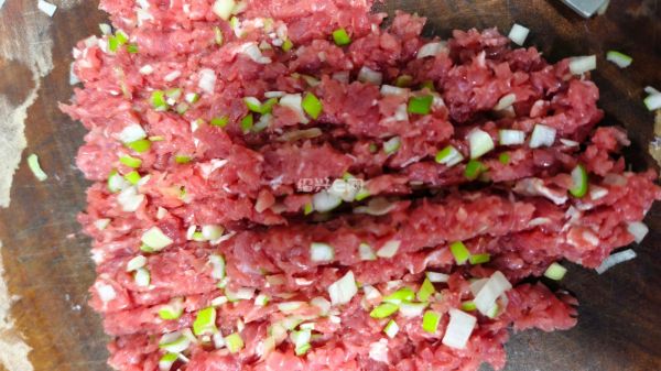 鲜切牛肉剁成馅,搭配泡软的米粉皮,煎到外皮焦香、内里多汁?