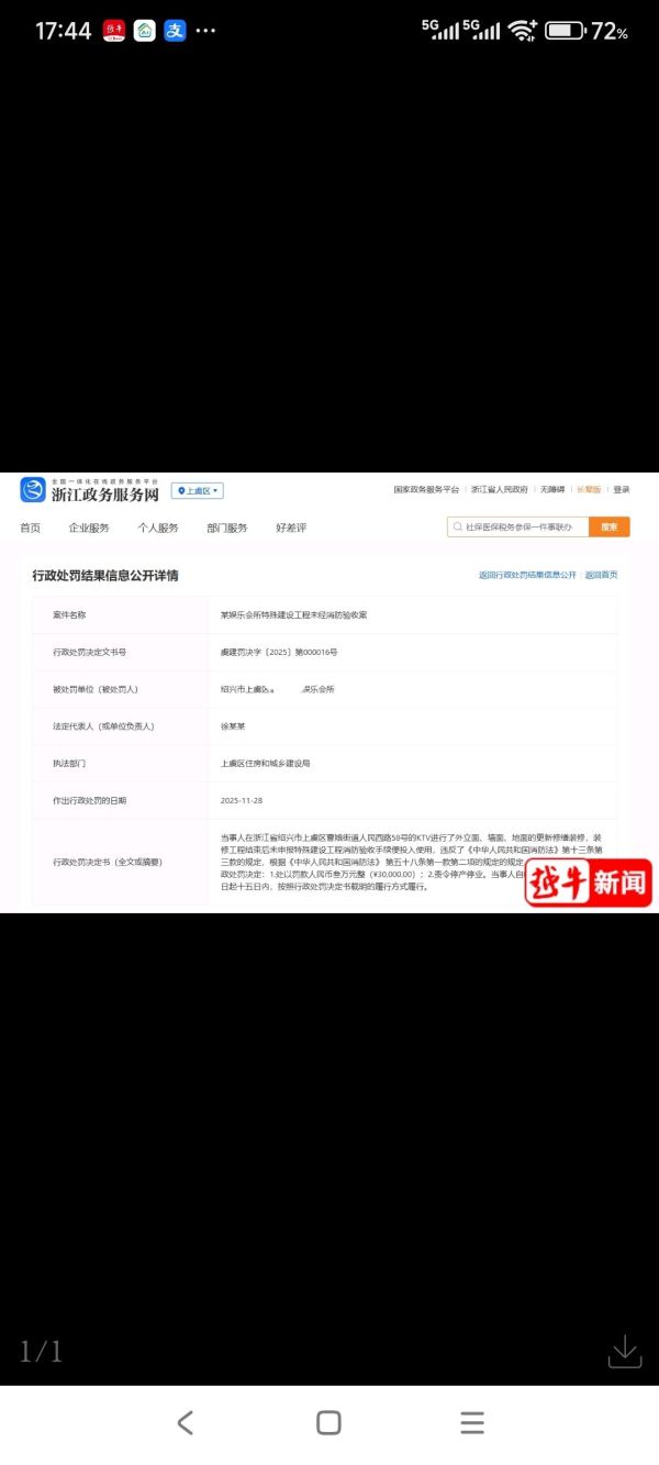 近日,浙江政务服务网公开一则行政处罚结果,绍兴一家娱乐会所特殊建设工程未经消防验收,被责令停产停业并罚款。