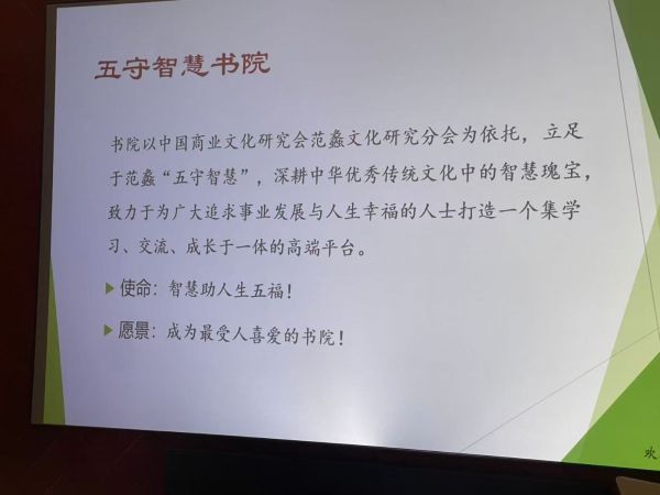 据了解,五守智慧书院以中国商业文化研究会范蠡文化研究分会为依托,立足于范蠡“五守智慧”,深耕中华优秀传统文化中的智慧瑰宝,致力于为广大追求事业发展与人生幸福的人士打造一个集学习、交流、成长于一体的高端平台。
