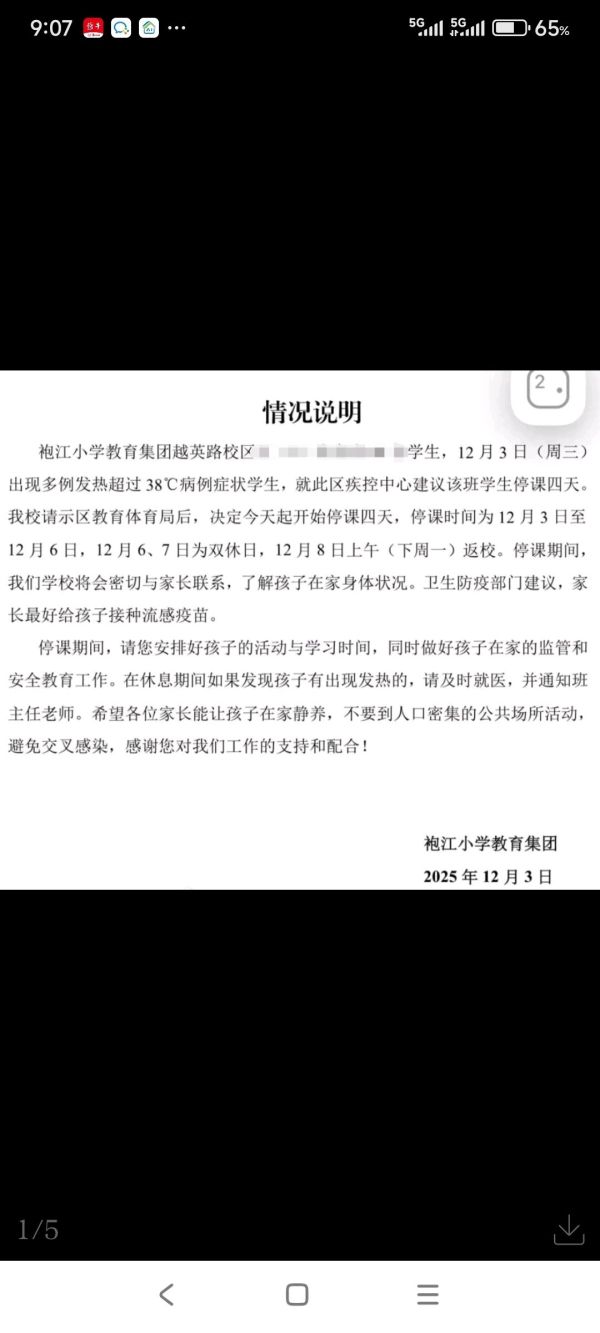 今天(12月4日),有网友向越牛新闻爆料,自己孩子所在的班级有多人发烧超过38℃,学校要求停课了。