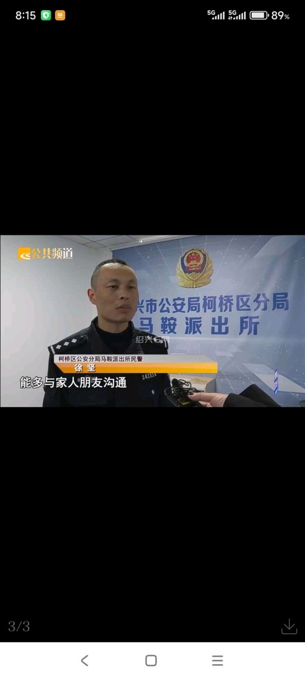 柯桥区公安分局马鞍派出所民警 徐坚:群众的生命安全重于泰山,无论何时何地,只要有危险,我们都会第一时间冲上去。也希望大家遇到矛盾和挫折时,能多与家人朋友沟通,珍惜自己的生命,切勿采取极端方式解决问题。
