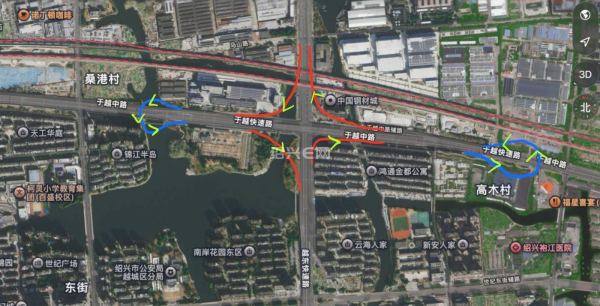 你这图上的四个闸道,都是不可能的,去实地看一下就知道。闸道不可能弄成这种角度的,太急了很容易出事故,而且实地没有那么大面积给你造高架桥,真的要贴着居民区外墙了
