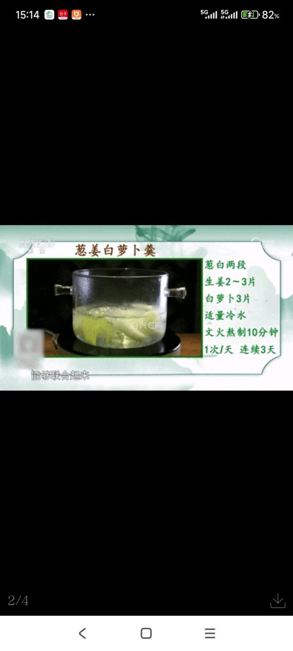 葱白两段、生姜2~3片、白萝卜3片、适量冷水,文火熬制10分钟,建议每天1次,连续服用3天。