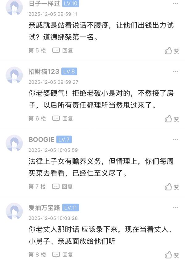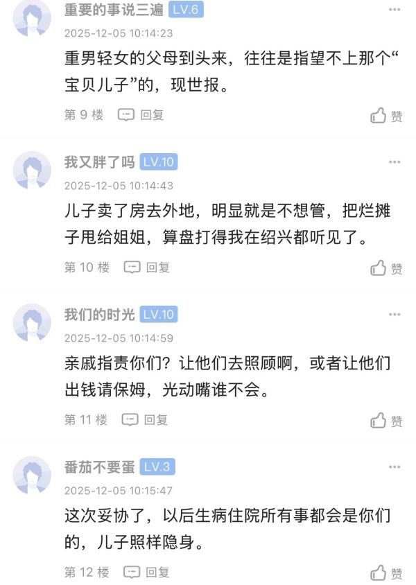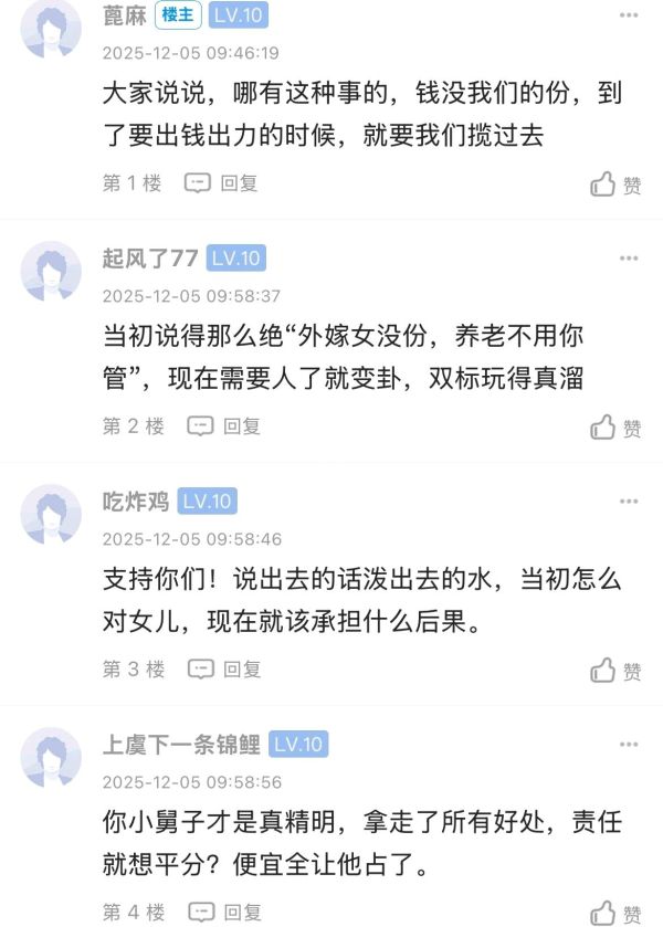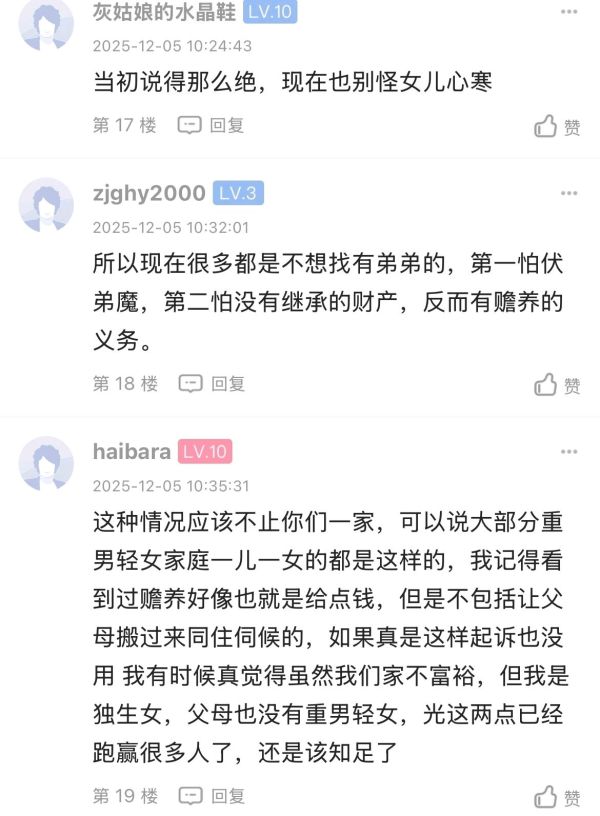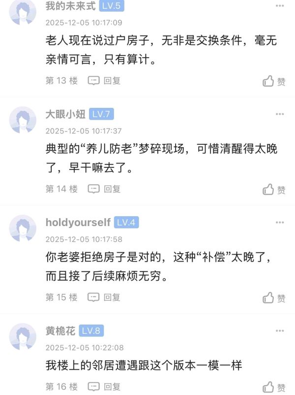 回 14楼(三变) 的帖子 图哥:我有个朋友也是这种情况,父母把所有财产都给小儿子,给小儿子全款买车买房,拆迁款全给小儿子,朋友一分钱没拿到,她生小孩养小孩娘家也没出一分钱,没帮着带一天小孩,结果小儿子结婚后,儿媳妇跟婆婆不合,小儿子又帮着自己老婆,两个人屁股掸掸住到城里去了。结果现在两老年纪 ..(2025-12-08 12:00)