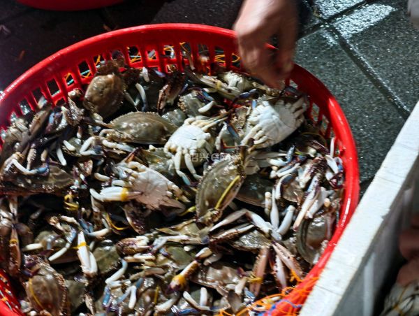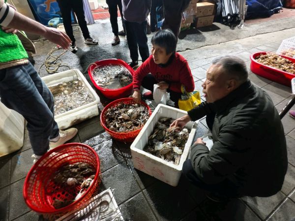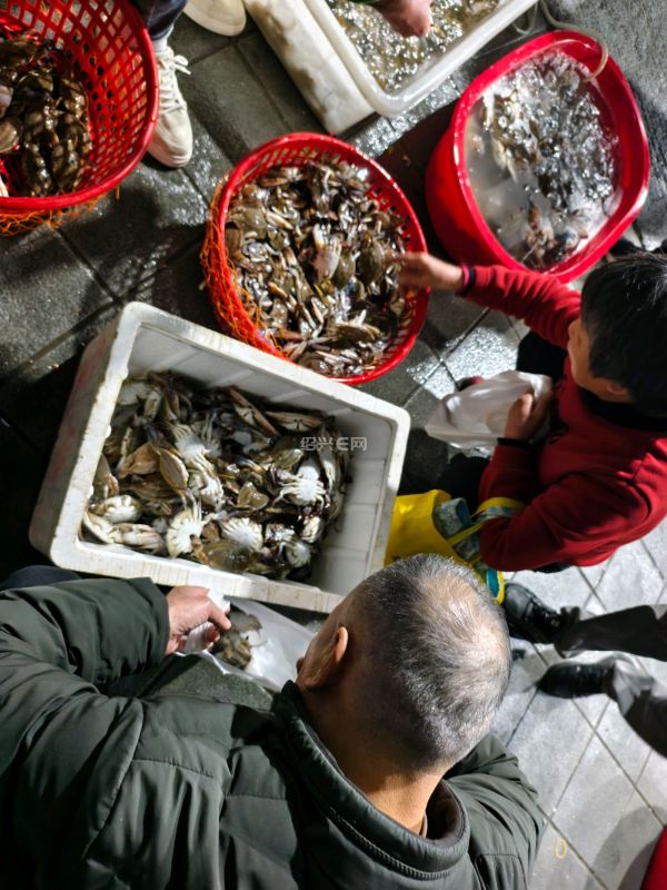 城南一生鲜超市门口,梭子蟹以三元一斤低价售卖,多数已死亡,仅余少量撑脚蟹,低廉价格吸引众多顾客围观挑选。
