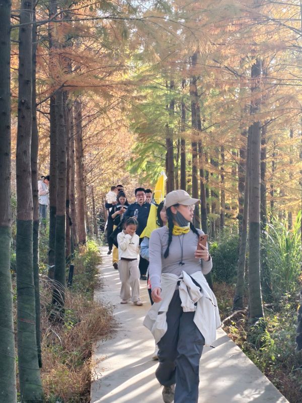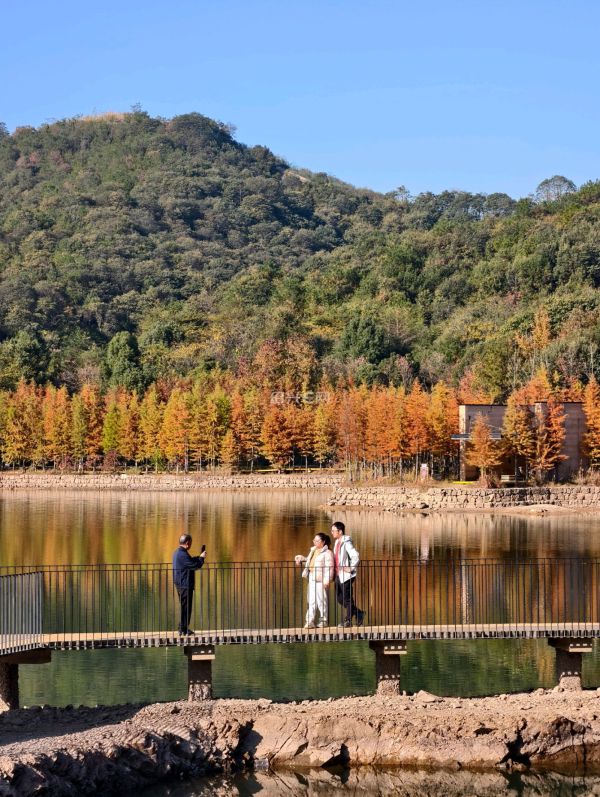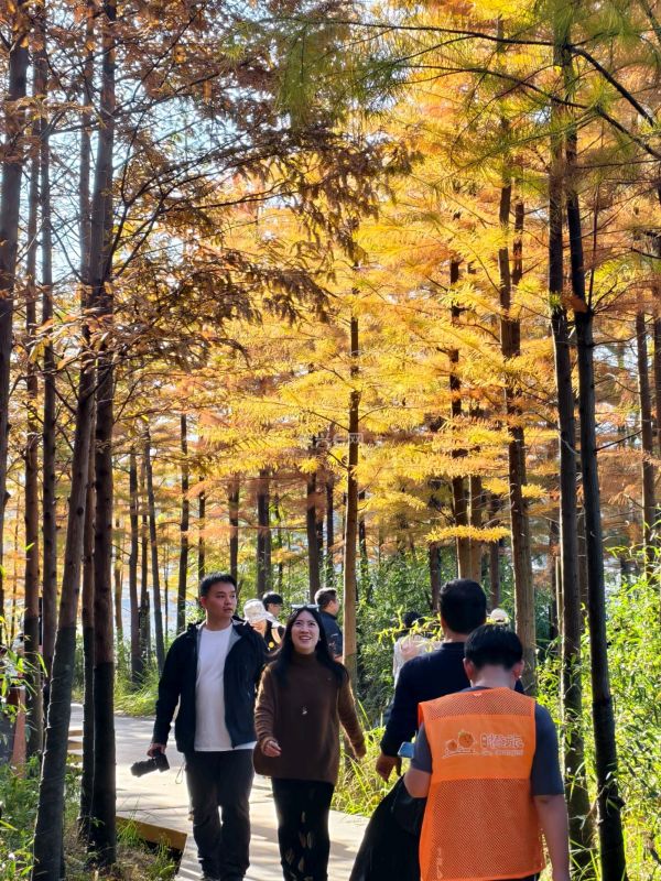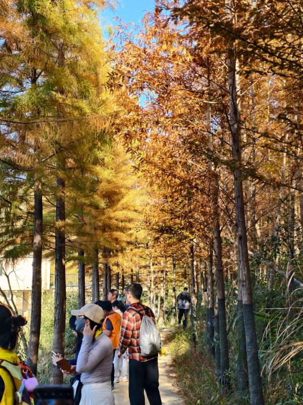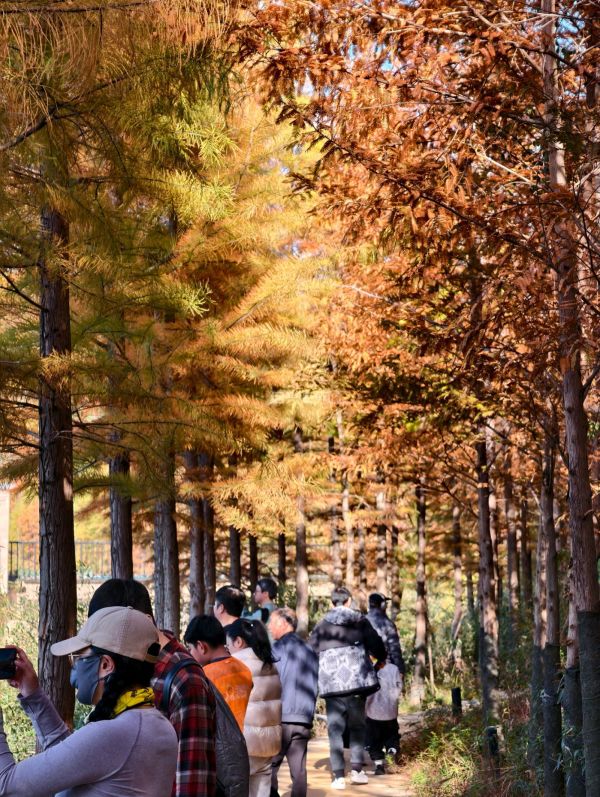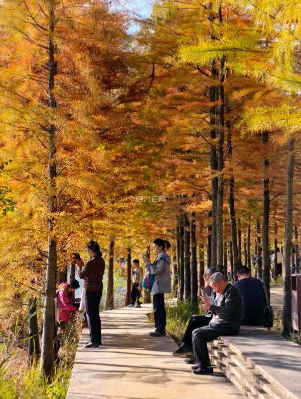 周末的凤凰山遗址公园的游客很多,遗址公园内的凤翎湖边水杉林迎来最佳观赏季。