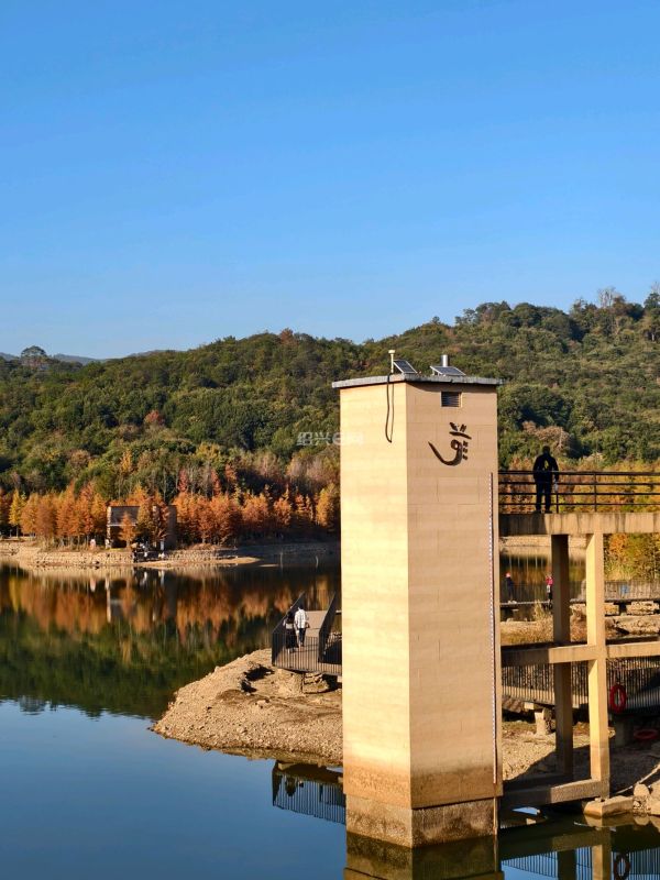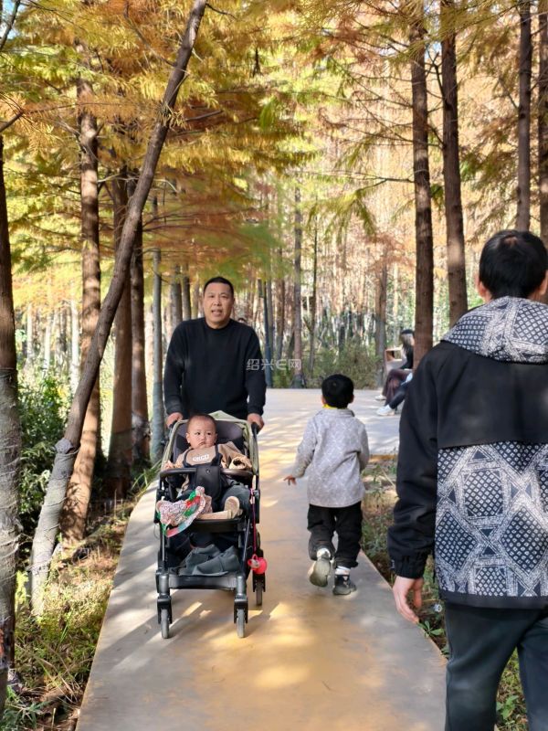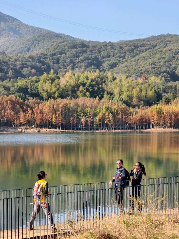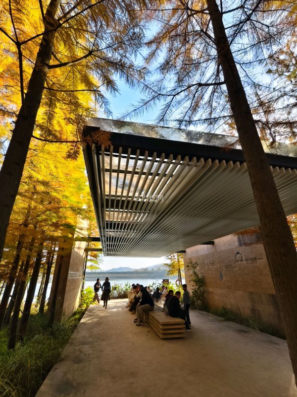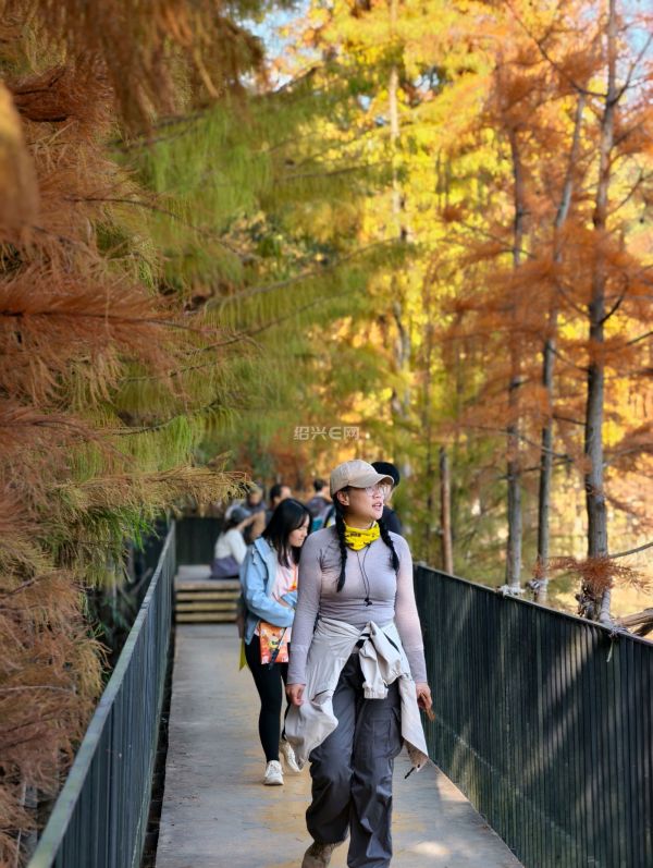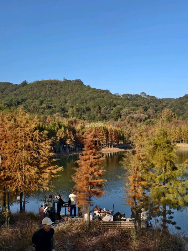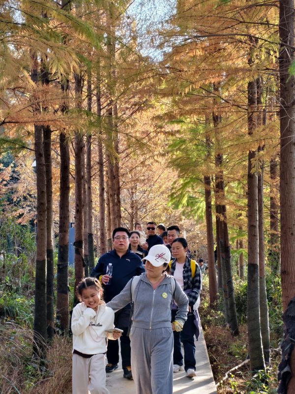 周末的凤凰山遗址公园的游客很多,遗址公园内的凤翎湖边水杉林迎来最佳观赏季。