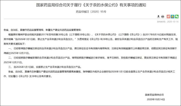 根据国家药监局综合司关于履行《关于汞的水俣公约》有关事项的通知,自2026年1月1日起,禁止生产含汞体温计和含汞血压计。通知要求: