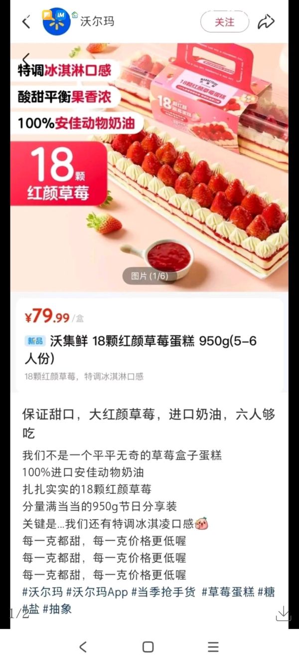 在两家品牌的小程序上,其宣传的草莓盒子蛋均标注为新品,其中沃尔玛18颗红颜草莓盒子蛋糕重为950g,售价79.99元。奥乐齐16颗红颜草莓盒子蛋糕重为450g,售价39.9元。