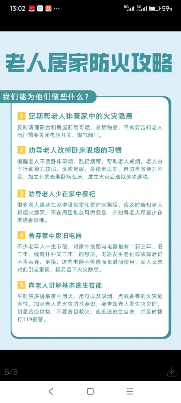 01、部分独居老人行动困难、视听能力下降,对灾害事故感知和应对不敏感;且独居老人消防安全意识薄弱,缺乏安全培训,常因卧床吸烟和电热器具使用不当等而引发火灾。一旦发生火灾,由于惊慌恐惧和行动不便极易造成悲剧的发生。