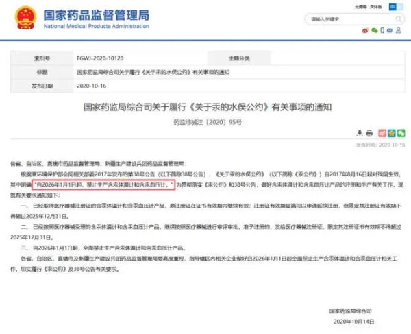 《关于汞的水俣公约》自2017年8月16日起对我国生效,其中明确“自2026年1月1日起,禁止生产含汞体温计和含汞血压计。”