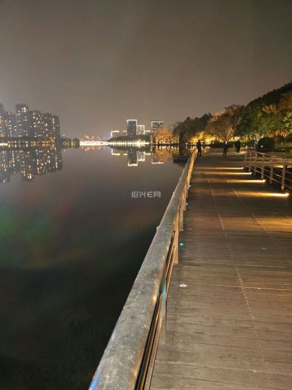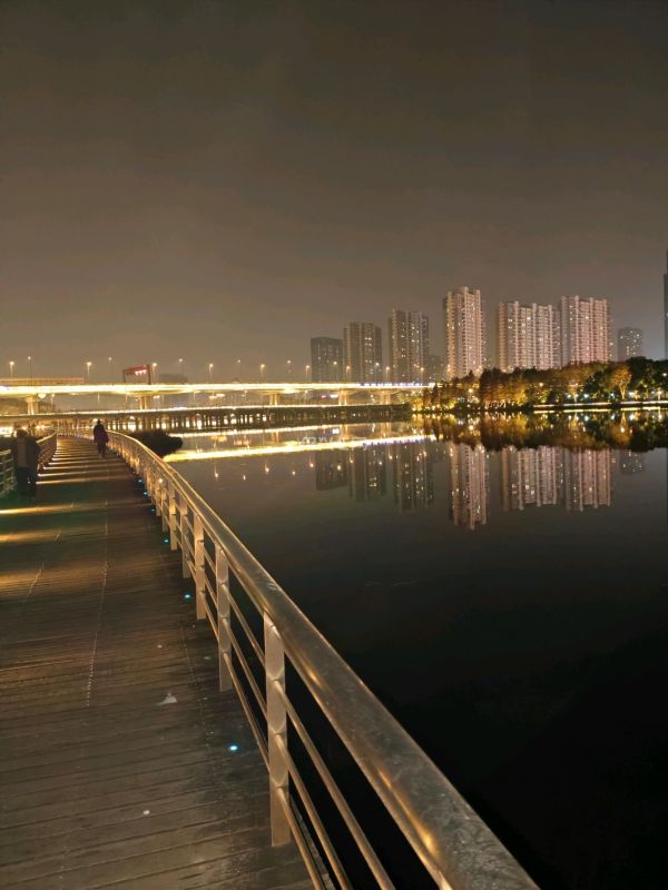 夜幕降临,梅山江两岸灯光璀璨,江边的夜晚宁静而美丽。