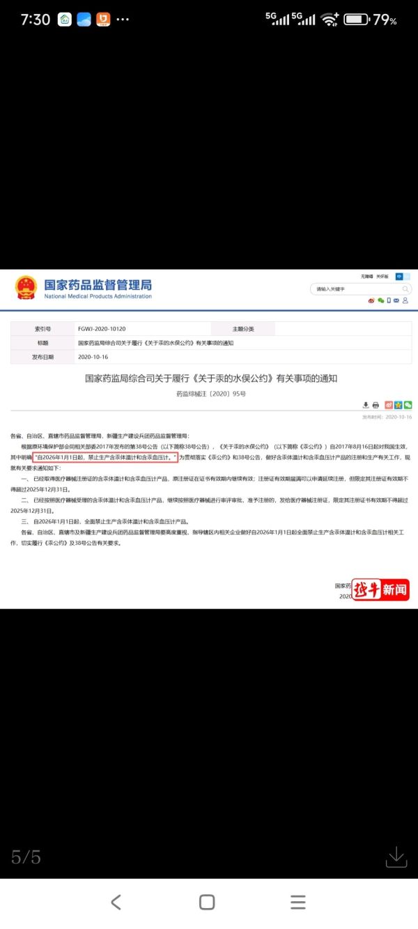 根据2017年对我国生效的《关于汞的水俣公约》及国家相关部门2017年第38号公告,明确要求自2026年1月1日起,禁止生产含汞体温计和含汞血压计。国家药监局2020年发布的《关于履行有关事项的通知》是对这一要求的国内落地执行。