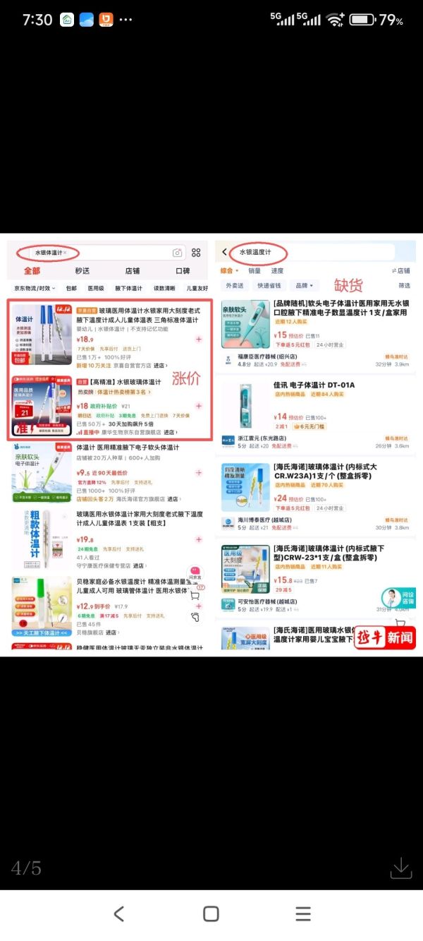 记者随后在美团买药、饿了么等本地生活买药平台,以及淘宝、京东等电商平台搜索发现,单支水银体温计售价虽仍标在8-10元左右,但多家店铺已显示“缺货”或“无货”。