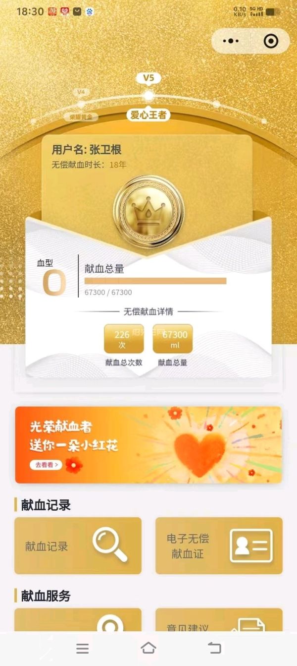 18年,226次献血,是一份沉甸甸的成绩单,更是一份无声的生命礼赞。张卫根用自己的热血,为他人撑起了生命的天空,为社会注入了温暖与希望。