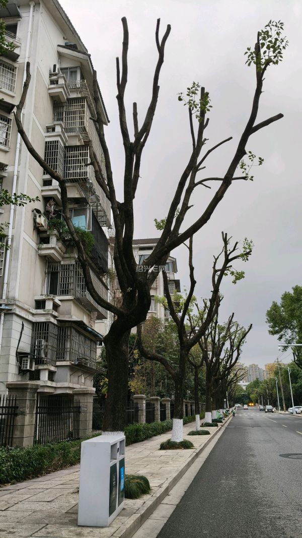 这里的行道树是香樟树,枝条比较脆,冬天万一下雪,枝条容易断裂,这样一修剪,就安全多了。另外,枝条修剪后对周边住户的采光也会有较大的改善!