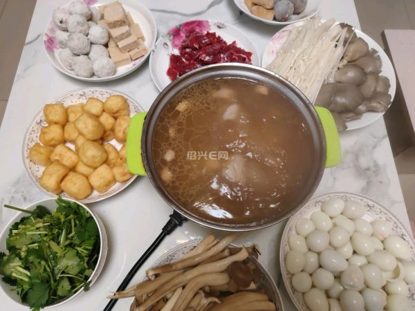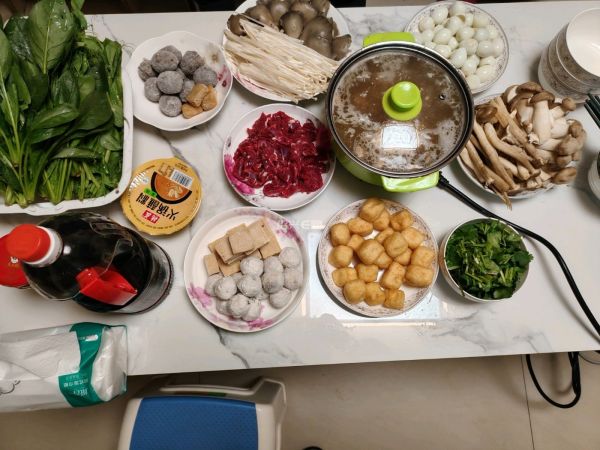 天一冷,就想吃火锅暖和一点,小孩子也很喜欢吃。在客厅的茶几上,一边看电视一边吃。食材是下班后刚买的,底料是烧牛蹄时留的蛋白冻加排骨汤,第一次买了德莊的火锅蘸料,相比去外面吃,经济又实惠,简单又巴适。