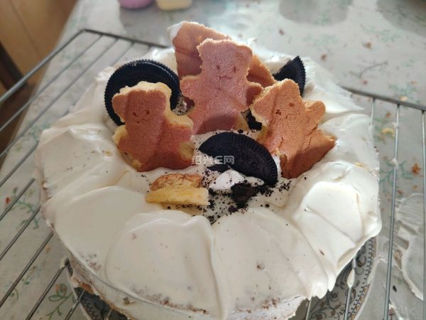 好久没做蛋糕了,今天就做一个。在烘烤时,要长时间(70分钟左右)低温(120度左右)烤制,不要为了快而高温烤制,那样容易外焦里不熟。由于没有裱花袋了,娃就自己想了个造型。蛋糕配方是依造APP“下厨房”十寸戚风蛋糕的方子。