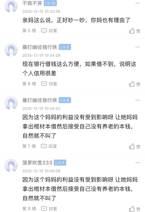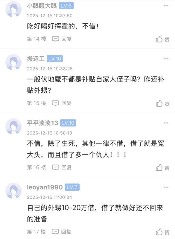 回 第4楼(真话阿大)的帖子 真话阿大:有一定经济实力亲戚有困难是要借给他,但有一个前提(如果是好吃懒做的还是算了) (2025-12-17 08:32)