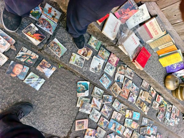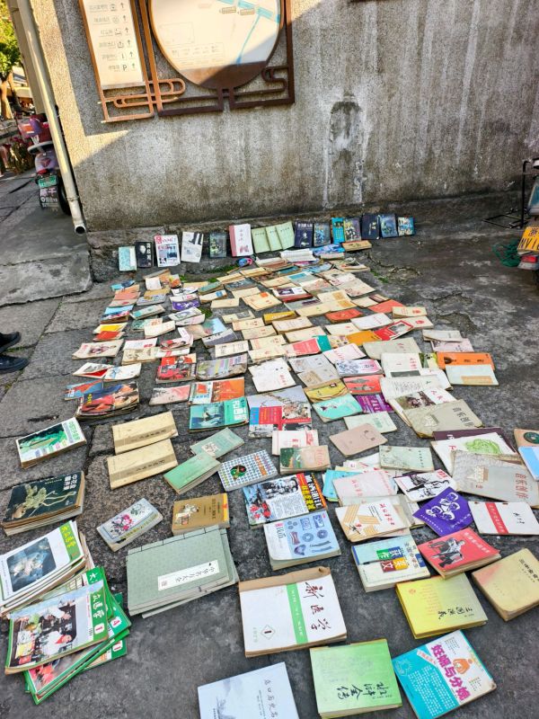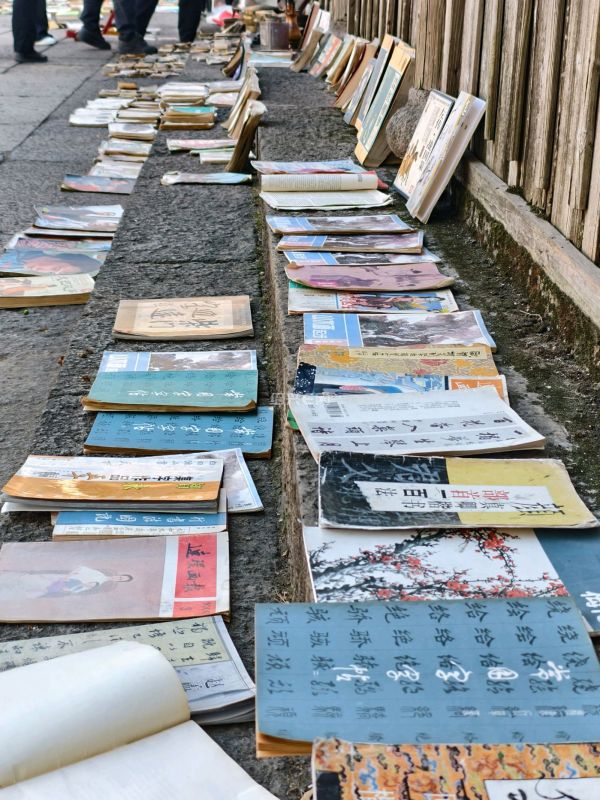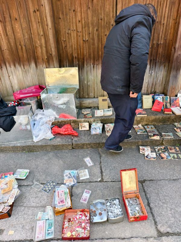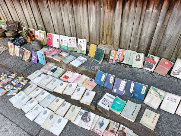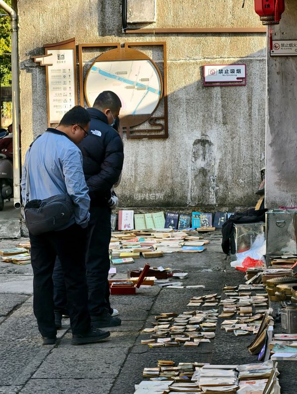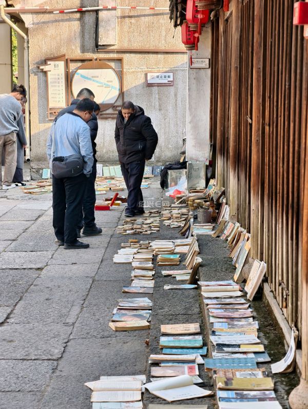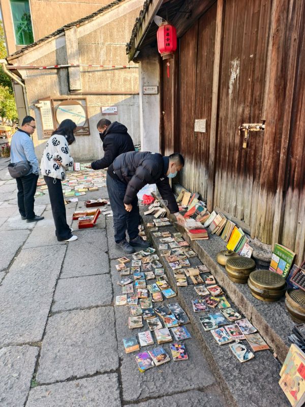 安昌古镇的旧书摊前,不少游客俯身翻找旧书、老杂志,老画册勾起回忆,小小书摊成了古镇里的别样风景,多了份市井生活。