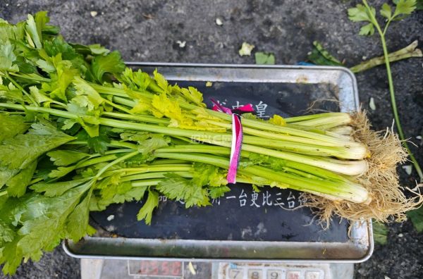 早晨的村口小摊,买了新鲜芹菜一把5元。