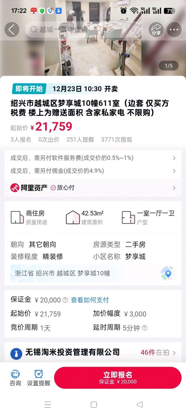 刚看到阿里拍卖上的一条拍卖信息,梦想城一套40多方的公寓带装修,起拍价仅2万多,是一套不是一个平方,还不设保留价。实际价格肯定不会那么低,看不懂这是什么操作?有什么猫腻 套路在里面,请懂行的分析分析