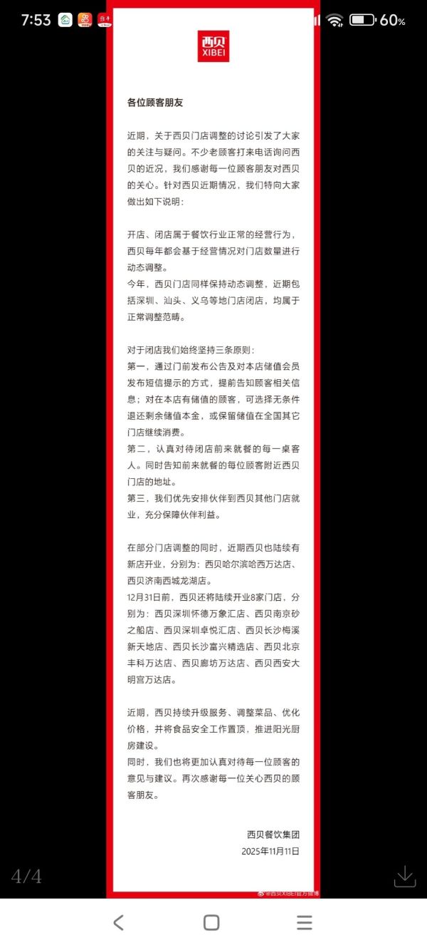 此前,不少地区就西贝门店关门引起不少网友关注,对此西贝XIBEI官方微博曾在11月11日发布一则关于门店调整的说明,其中表示“开店、闭店都属于餐饮行业正常的经营行为,西贝每年都会基于经营情况对门店数量进行动态调整。”