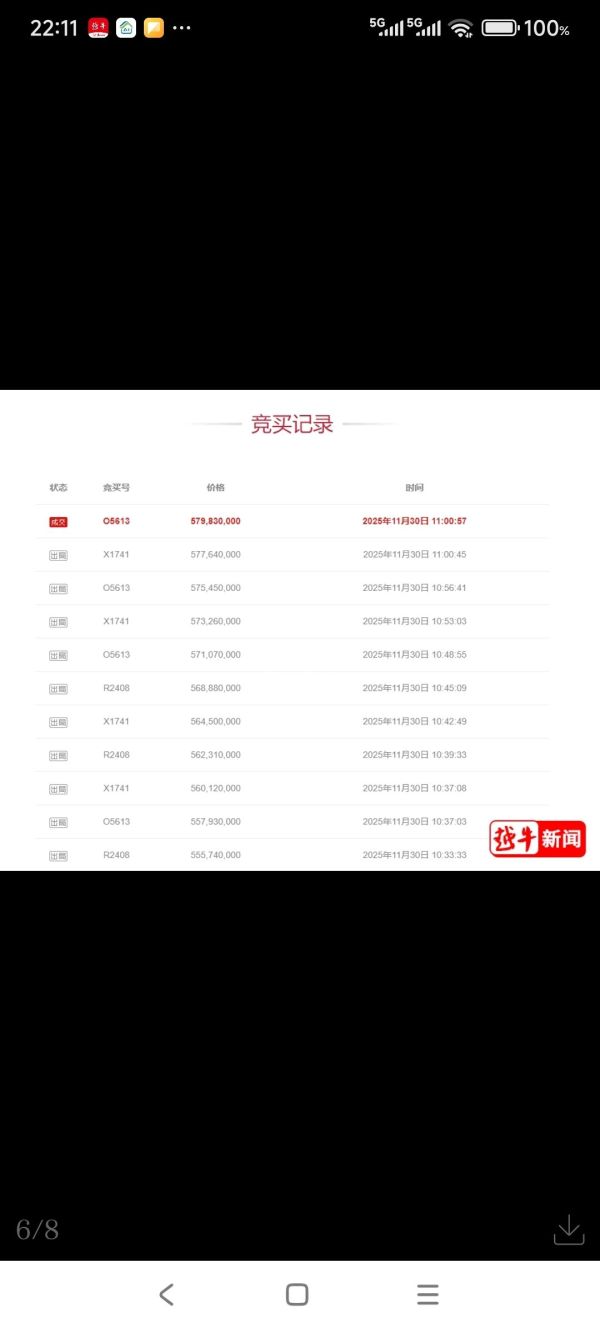 这场拍卖大战从11月29日上午10点正式开始,根据阿里拍卖平台数据显示,整个竞价过程共产生57次出价记录,过程堪称紧张。