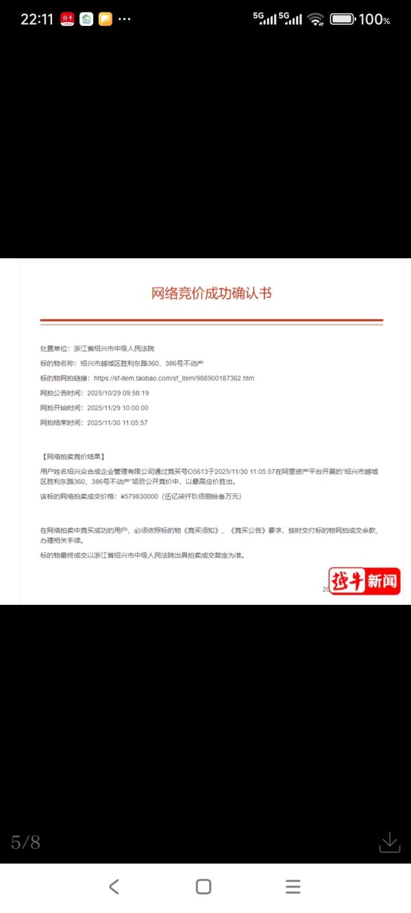 起拍价为4.3967亿元,每次加价幅度为219万元。5家竞买人你追我赶,互不相让,最终绍兴众合成企业管理有限公司(竞买号O5613)以5.798亿元的价格锁定胜局。