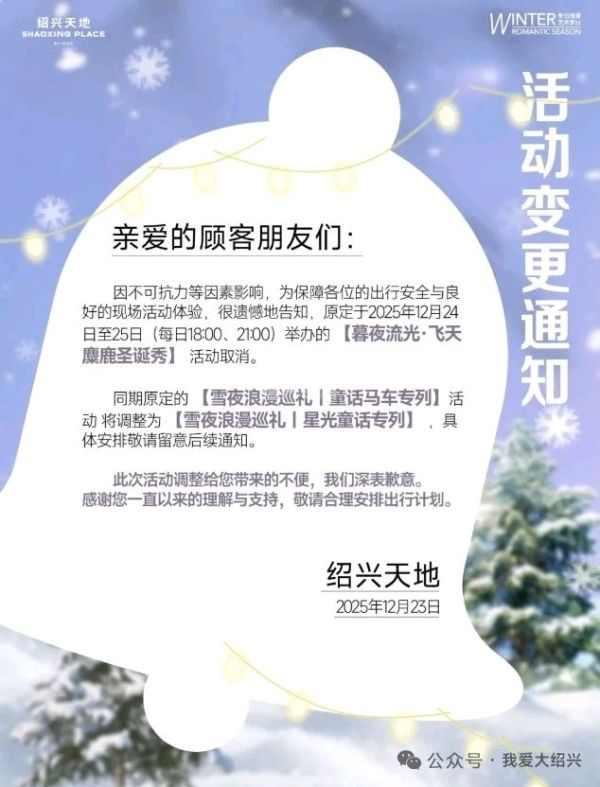 取消活动:2025年12月24日-25日(每日18:00、21:00)的【暮夜流光·飞天麋鹿圣诞秀】