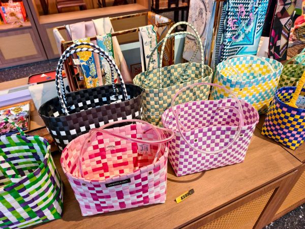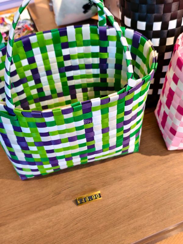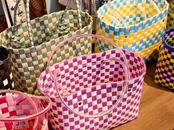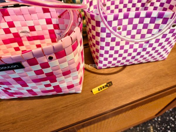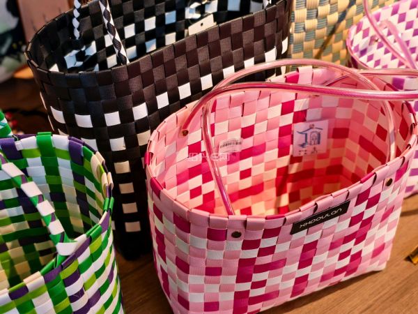 越王城文创店里,塑料包装带款式编的手提篮成了潮品,色彩鲜艳款式多,价格很亲民。