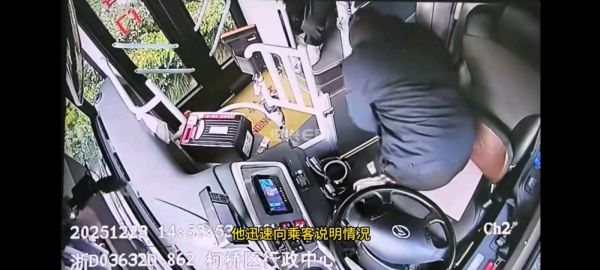 14时53分许,车辆行至柯桥区行政中心附近路口等红灯时,一名中年男子突然慌张地跑向公交车,焦急呼喊道:“师傅!我的车着火了!”