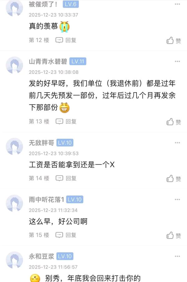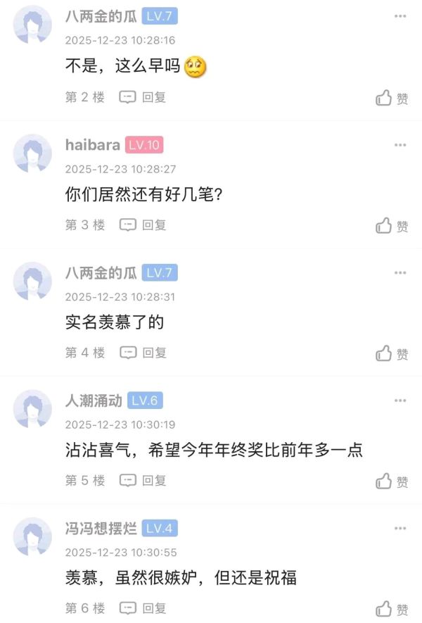 前几天到了第一笔年终到账,大家今年年终奖发了没?有比我早的吗?
