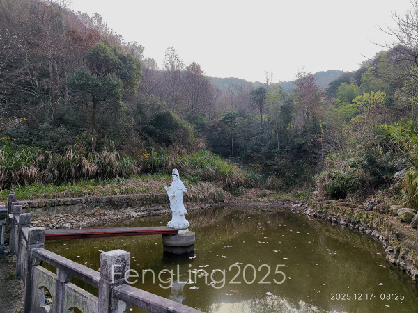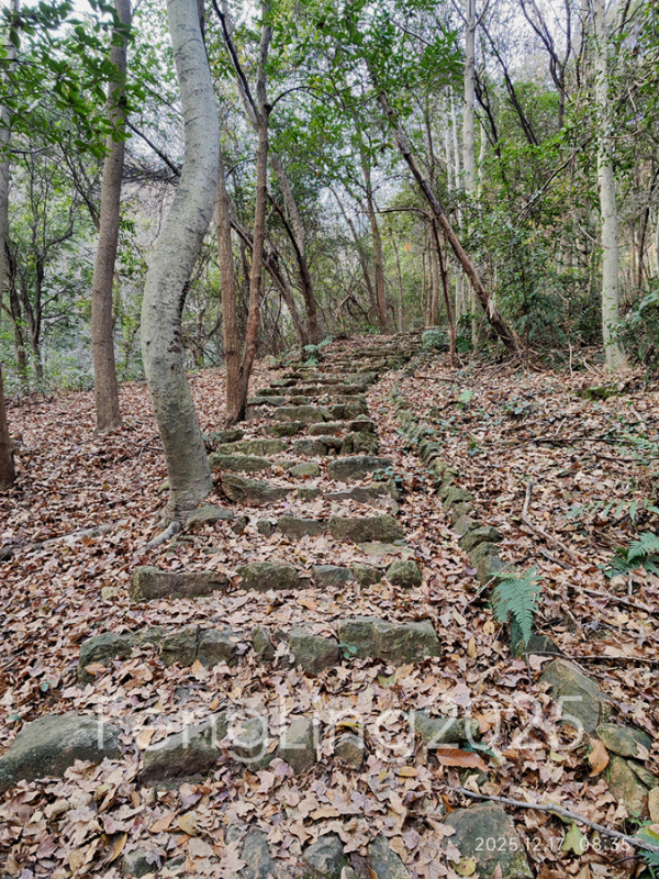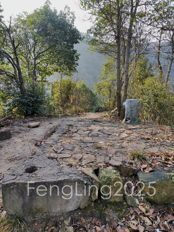 秦望山道的入口标识也有好几年了,游步道石阶也有了苔藓的痕迹,被落叶覆盖着,半路的竹亭早已拆掉。到达山顶,往后岭方向下山,从山上可以看见后岭村和半山的法华庵。