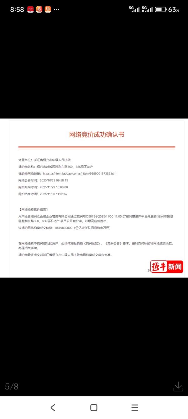 今年11月30日,经过线上拍卖平台长达一天多、共计57轮的激烈竞价,绍兴众合成企业管理有限公司最终以5.7983亿元的价格,成功竞得世茂广场资产。