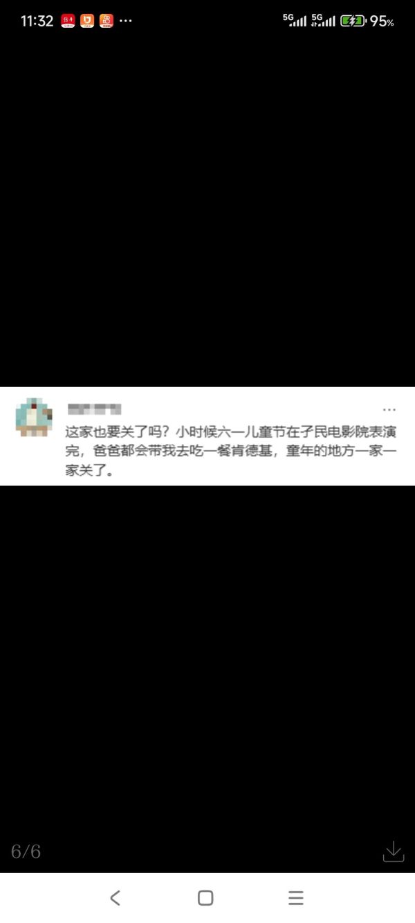 “小时候六一儿童节在孑民电影院表演完,爸爸都会带我去吃一餐肯德基,童年的地方一家一家关了。”