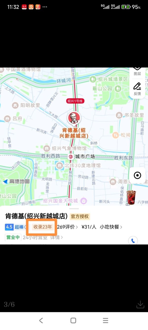 目前,门店还在正常营业,根据高德地图信息,肯德基绍兴新越城店已被收录23年。