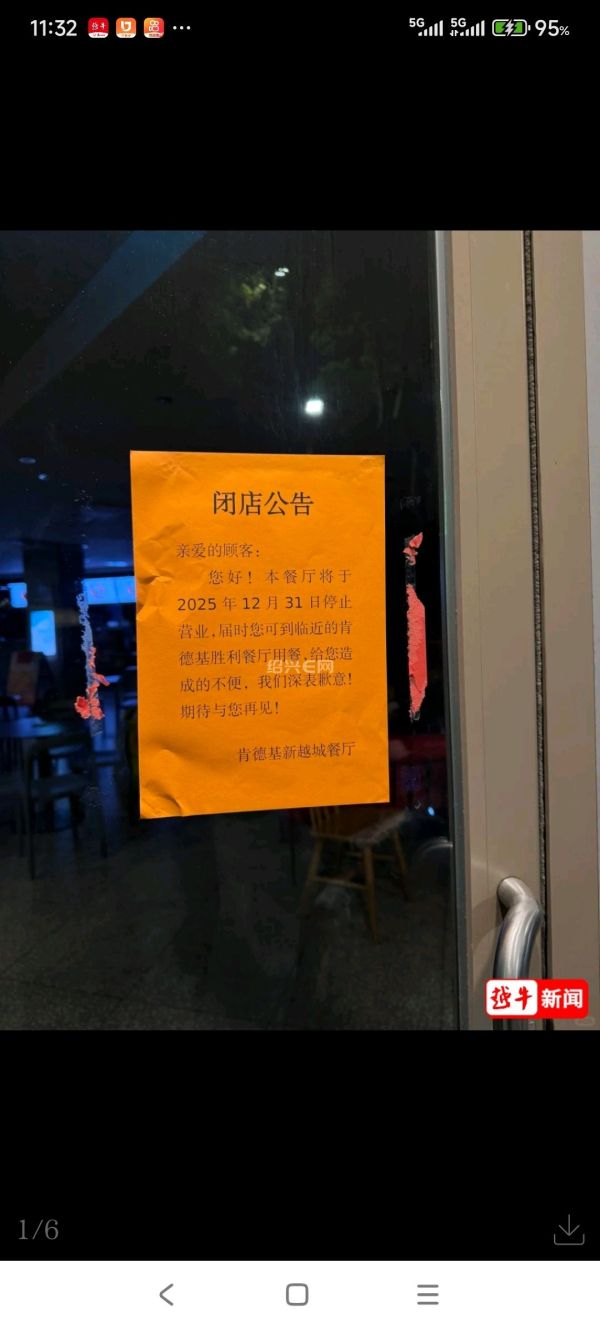 根据网友发布的照片显示,在该门店醒目位置已经张贴了闭店公告,明确提示顾客,餐厅将于2025年12月31日停止营业。公告同时指引顾客,此后可前往临近的肯德基胜利餐厅继续用餐。