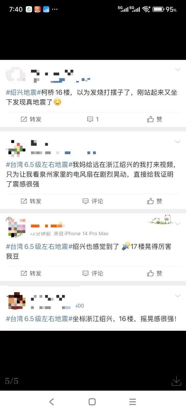 不仅福建沿海多地震感明显,也有绍兴网友称“在家有很强震感,人很晕。”“摇了好久!”