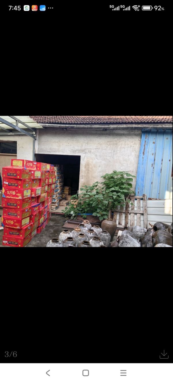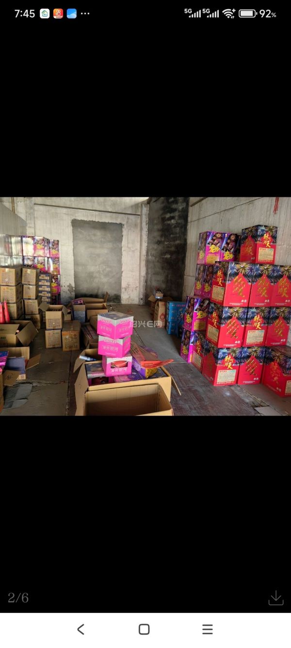 一老旧仓库内非法储存烟花爆竹,地上杂乱堆积着百余箱烟花爆竹。