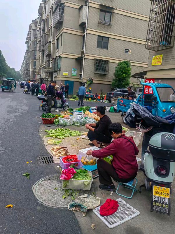 首先,让我们将目光投向小区内部道路。一块明黄色的“小区内 禁止摆摊”告示牌,在居民楼的背景下显得格外醒目、庄严。它清晰地界定了规则,宣示了秩序的存在。然而,就在这庄严的告示牌正下方,生活展示了它强大的韧性:青菜水灵,玉米饱满,两位摊贩——一位身着黑衣蹲守,一位红衣端坐——正整理着他们的商品。旁边的三轮车与电动车,是他们“起早贪黑”的移动仓库与生计依靠。路面的湿润反着光,仿佛刚下过雨,冲洗出了这规则与现实之间微妙而清晰的交界线。这一幕充满了哲学的张力:禁止,是为了更好地定义“被允许的存在”。