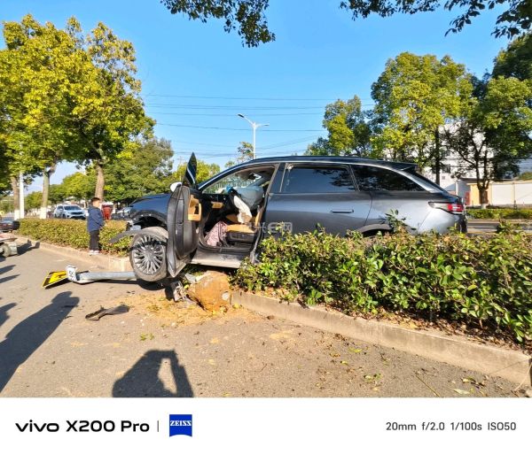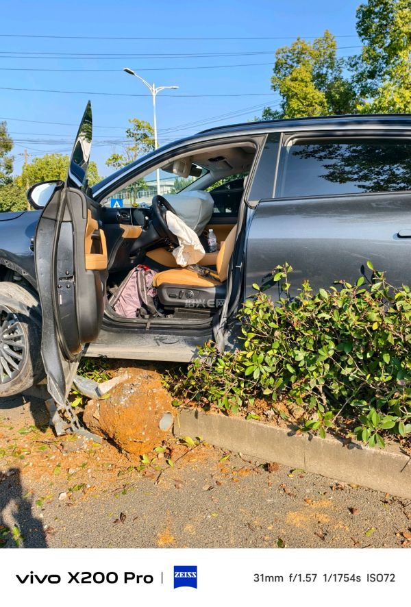 平水农商学院旁,一辆私家从自行车道冲到对向车道,中间隔离栏撞飞 车撞到绿化带上 气囊弹出 人没事