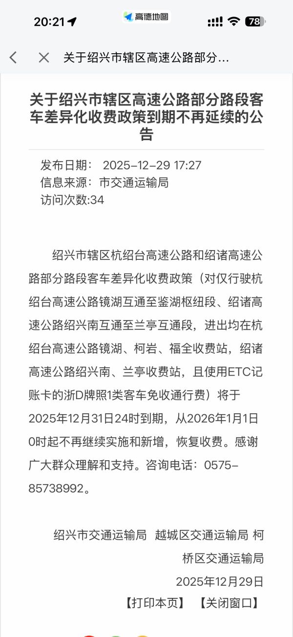 绍兴市辖区杭绍台高速公路和绍诸高速公路部分路段客车差异化收费政策(对仅行驶杭绍台高速公路镜湖互通至鉴湖枢纽段、绍诸高速公路绍兴南互通至兰亭互通段,进出均在杭绍台高速公路镜湖、柯岩、福全收费站,绍诸高速公路绍兴南、兰亭收费站,且使用ETC记账卡的浙D牌照1类客车免收通行费)将于2025年12月31日24时到期,从2026年1月1日0时起不再继续实施和新增,恢复收费。