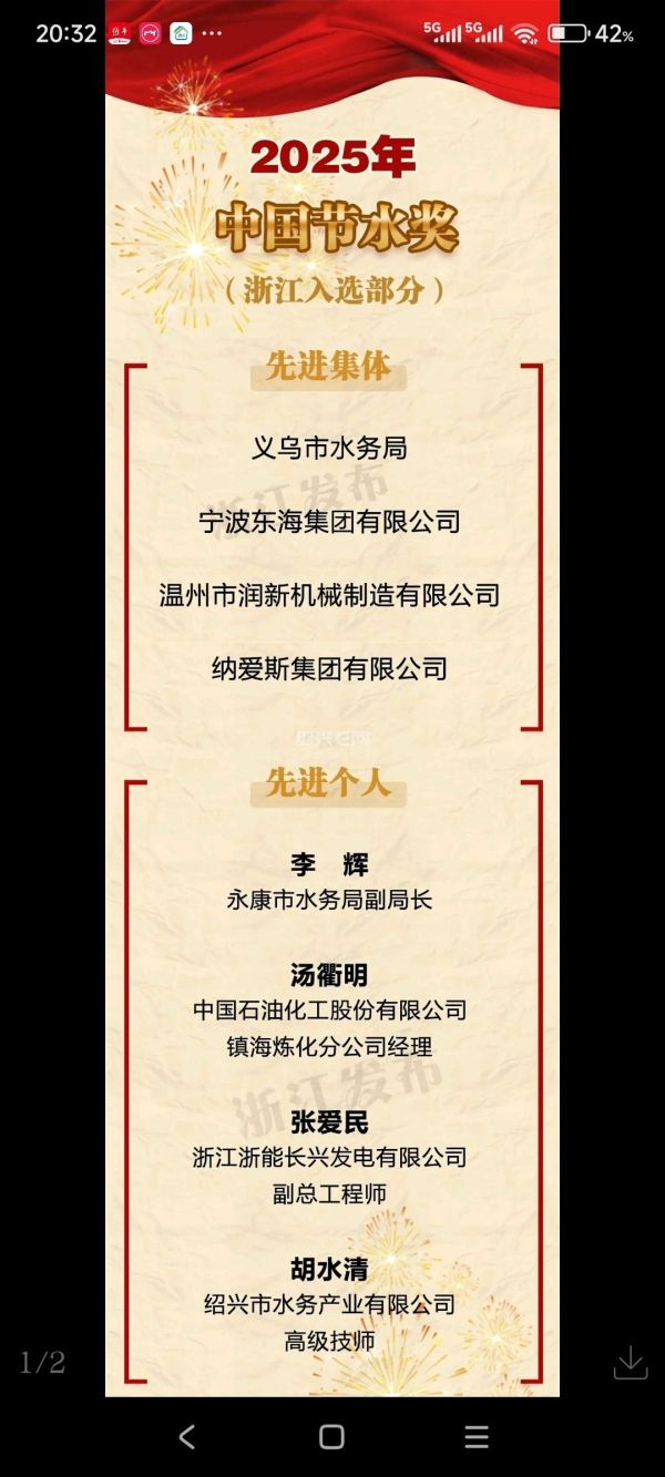 近日,水利部发文表彰2025年中国节水奖先进集体和先进个人,决定授予北京市水务局北京市节约用水办公室等149个单位“中国节水奖先进集体”称号,授予朱华等199名同志“中国节水奖先进个人”称号。其中,浙江4个集体、4名个人上榜,绍兴人胡水清榜上有名: